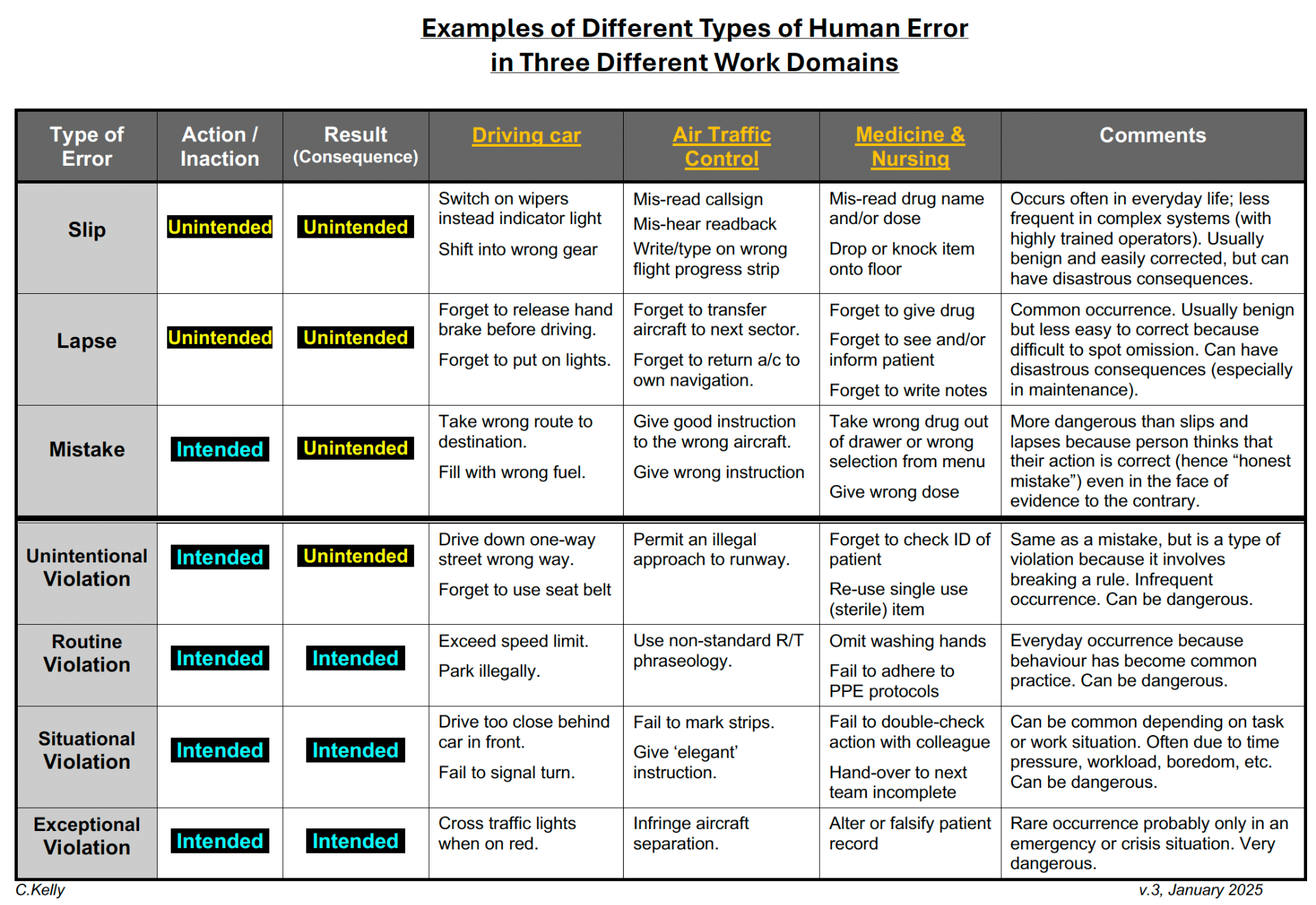 I produced the first version of the table opposite in the late 1990s, while working at DERA. I was the lead researcher on a "Proposal to develop a concept and taxonomy for human error in ATM" (submitted to EUROCONTROL). The proposal was unsuccessful, but I did usefully cross paths with Professors Neville Moray and Patrick Hudson who were part of our project team. I vaguely recall that I constructed the table based on something Prof. Hudson had written, which I then elaborated with the 'work domain' examples, but it's a long time ago!